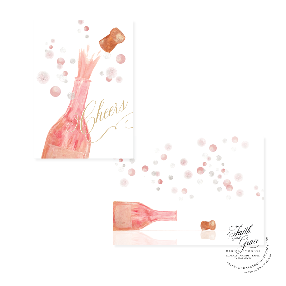 A pink champagne bottle is surrounded by pink and silver bubbles, accompanied by Cheers.