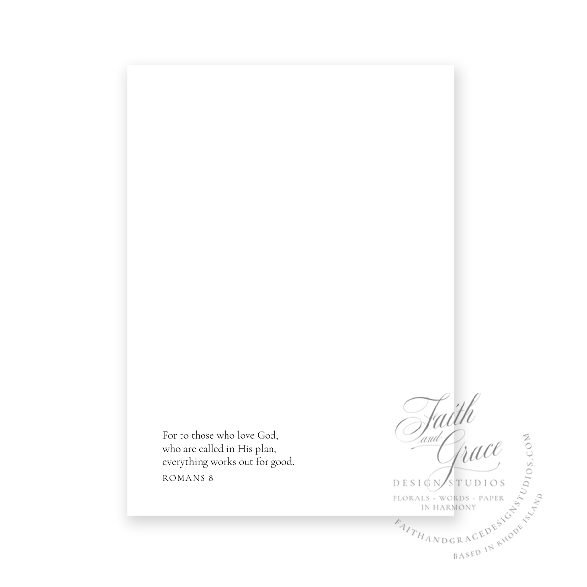 Inside left corner reads: "For to those who love God, who are called in His plan, everything works out for good. Romans 8"