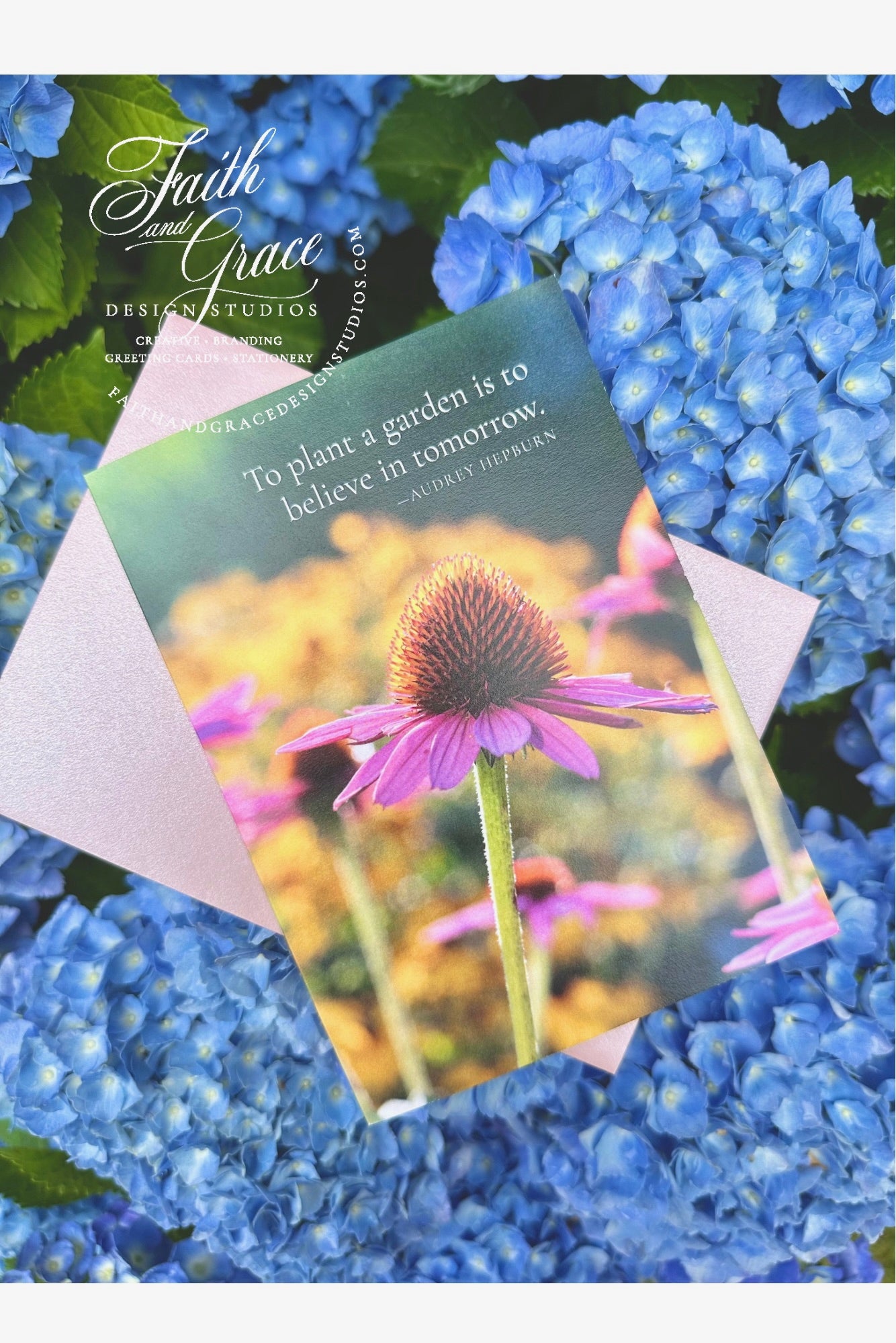This high quality encouragement greeting card features a beautiful sunny photograph of echinacea in a perennial summer flower garden, paired with the inspiring quote, "To plant a garden is to believe in tomorrow. —Audrey Hepburn" on the front. Inside, the left corner offers a comforting message from Romans 12:12: "Be joyful in hope, patient in affliction, faithful in prayer." Perfect for uplifting someone with hope and faith.