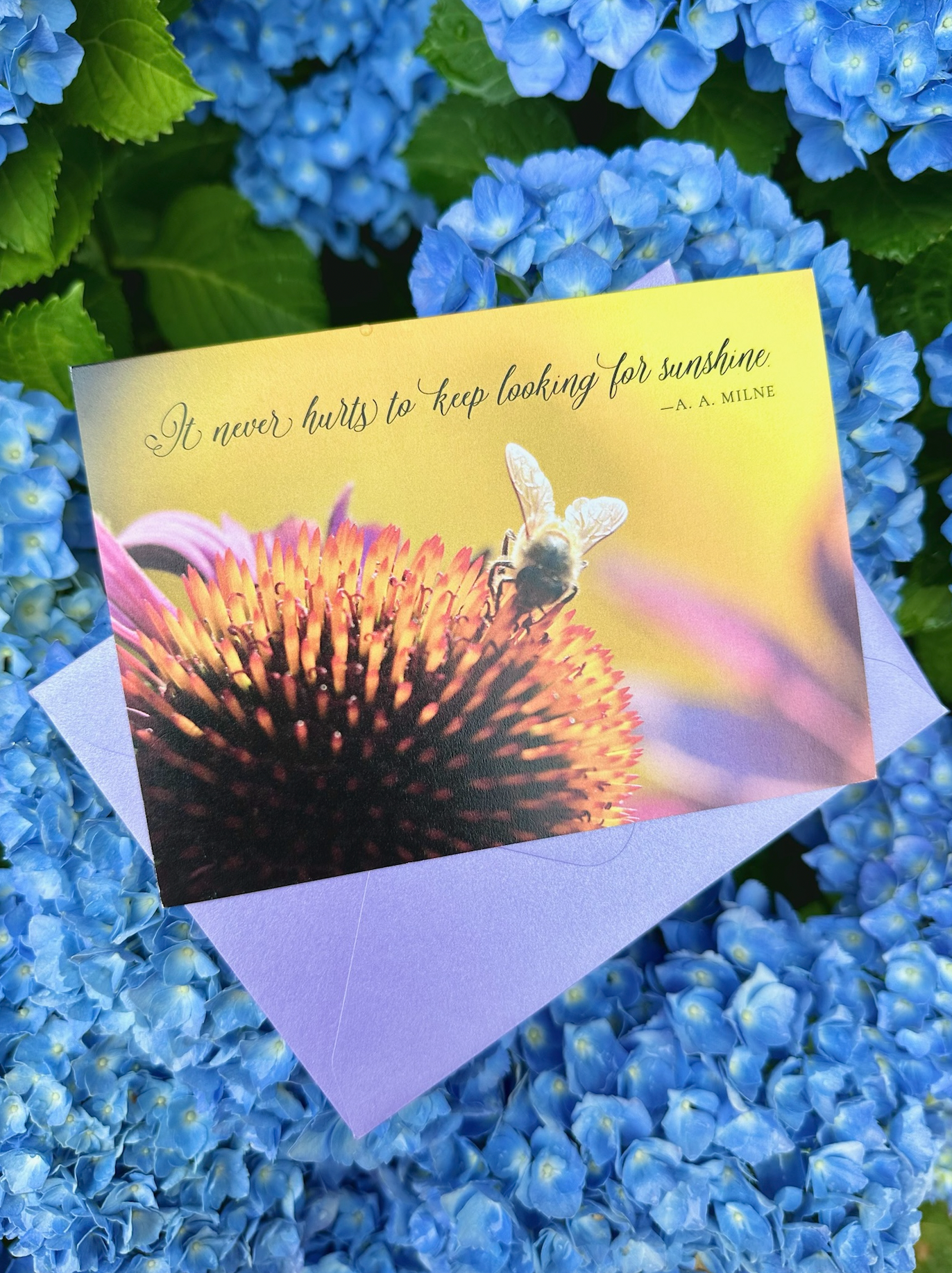 The Keep Looking for Sunshine Greeting Card offers a comforting message of hope and perseverance. Featuring a warm, golden-lit photo of a perennial echinacea with a fuzzy bumblebee, it carries the gentle reminder, “It never hurts to keep looking for sunshine” by A. A. Milne. This card is a thoughtful way to encourage and support loved ones through life’s challenges.