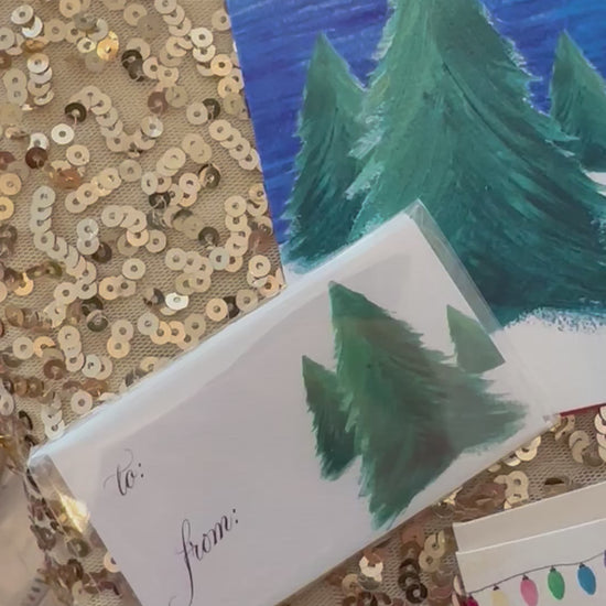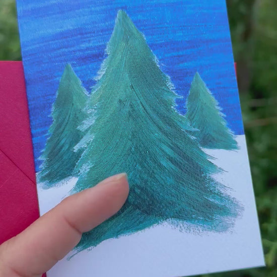 The front features hand-painted Christmas trees in the snow against an evening winter sky.
