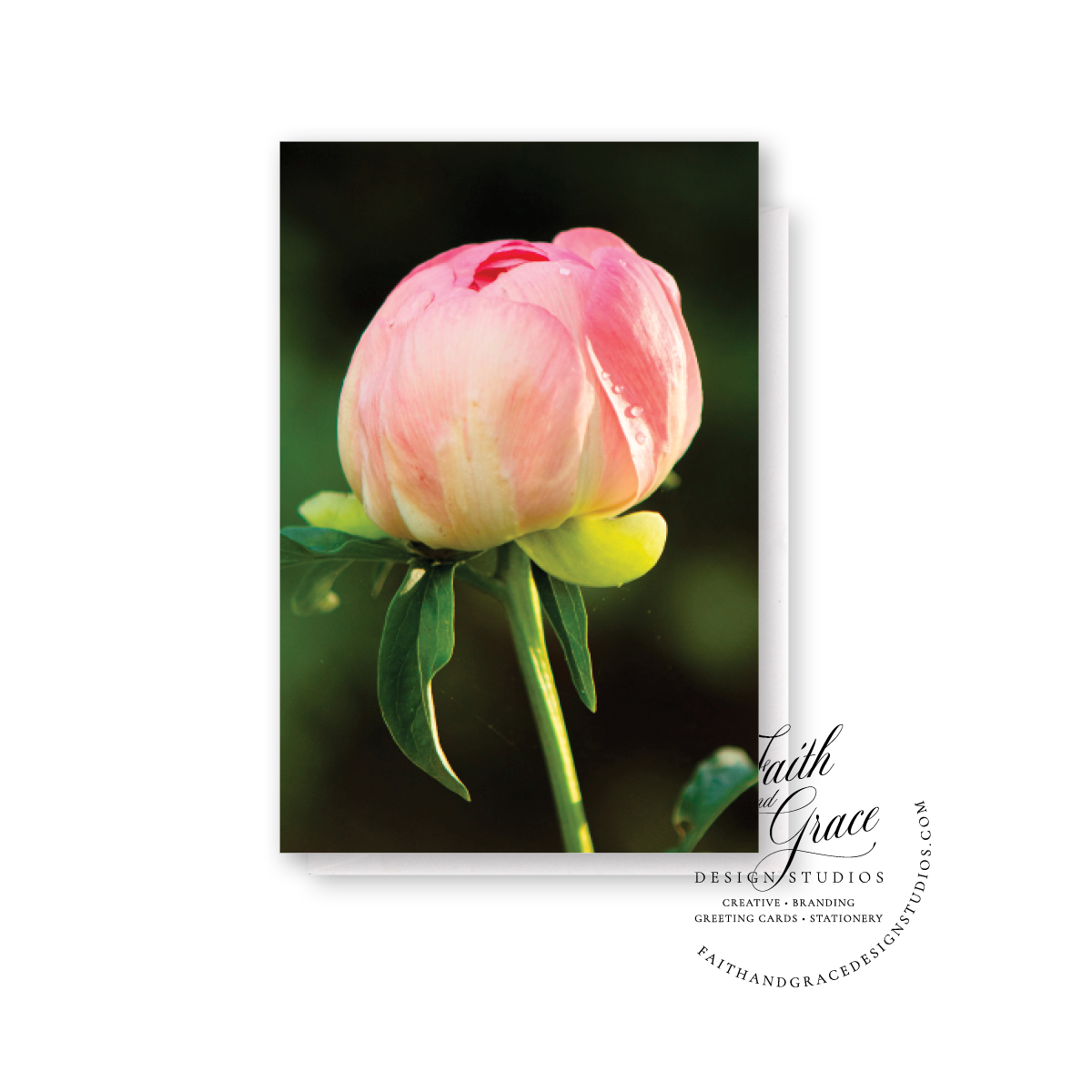 Pink Peony Bud in the garden adorns the front of this blank notecard.