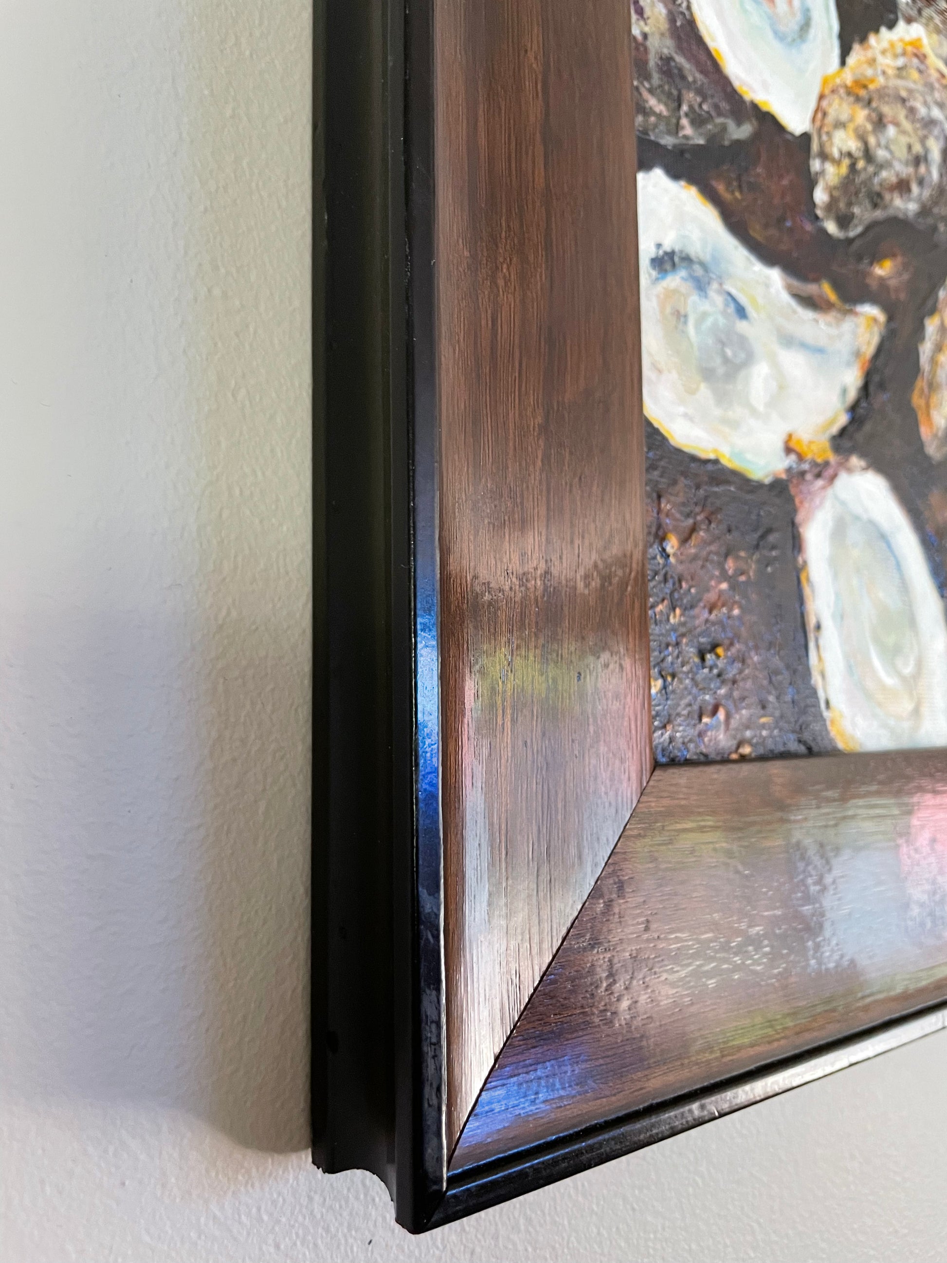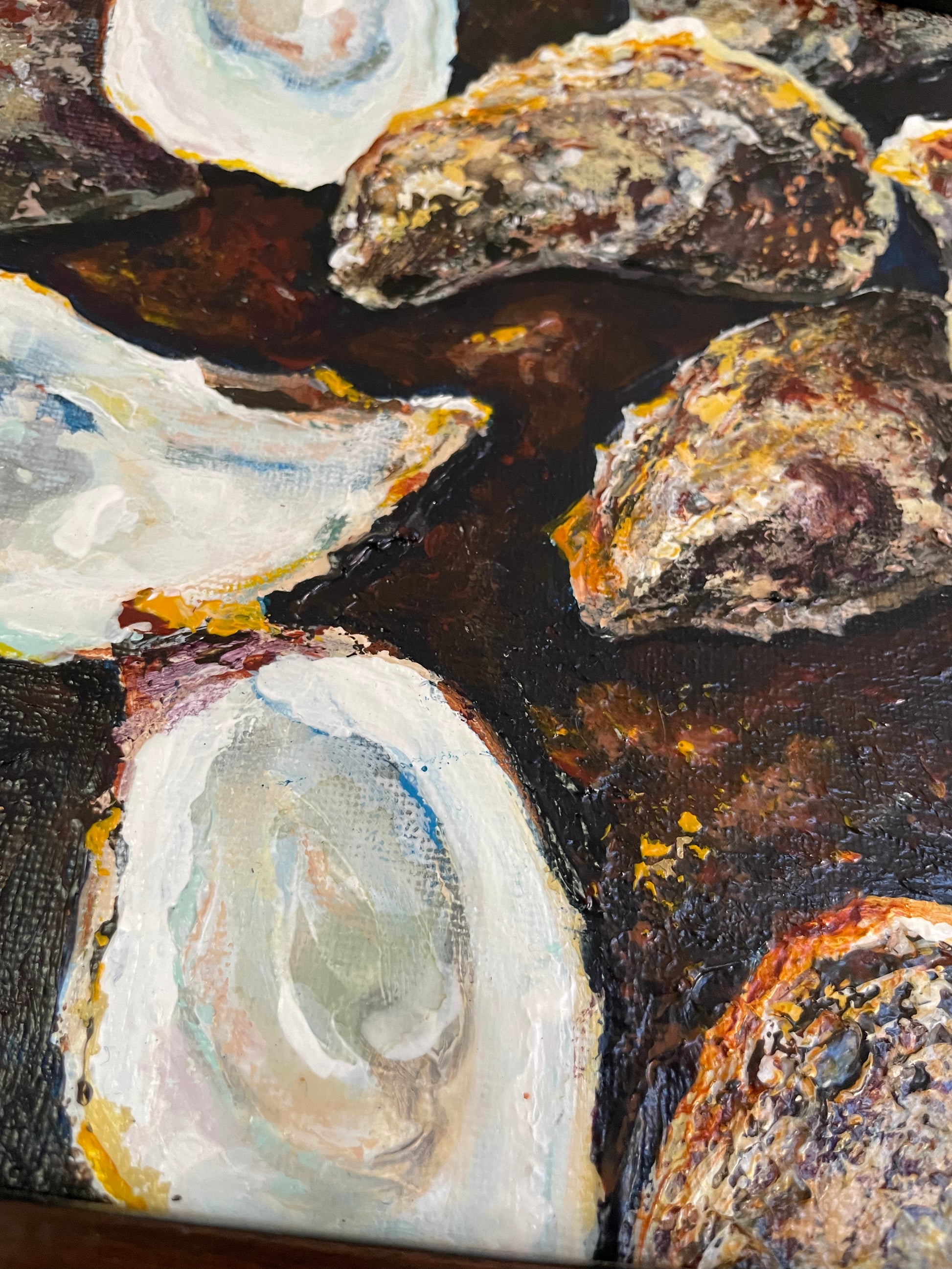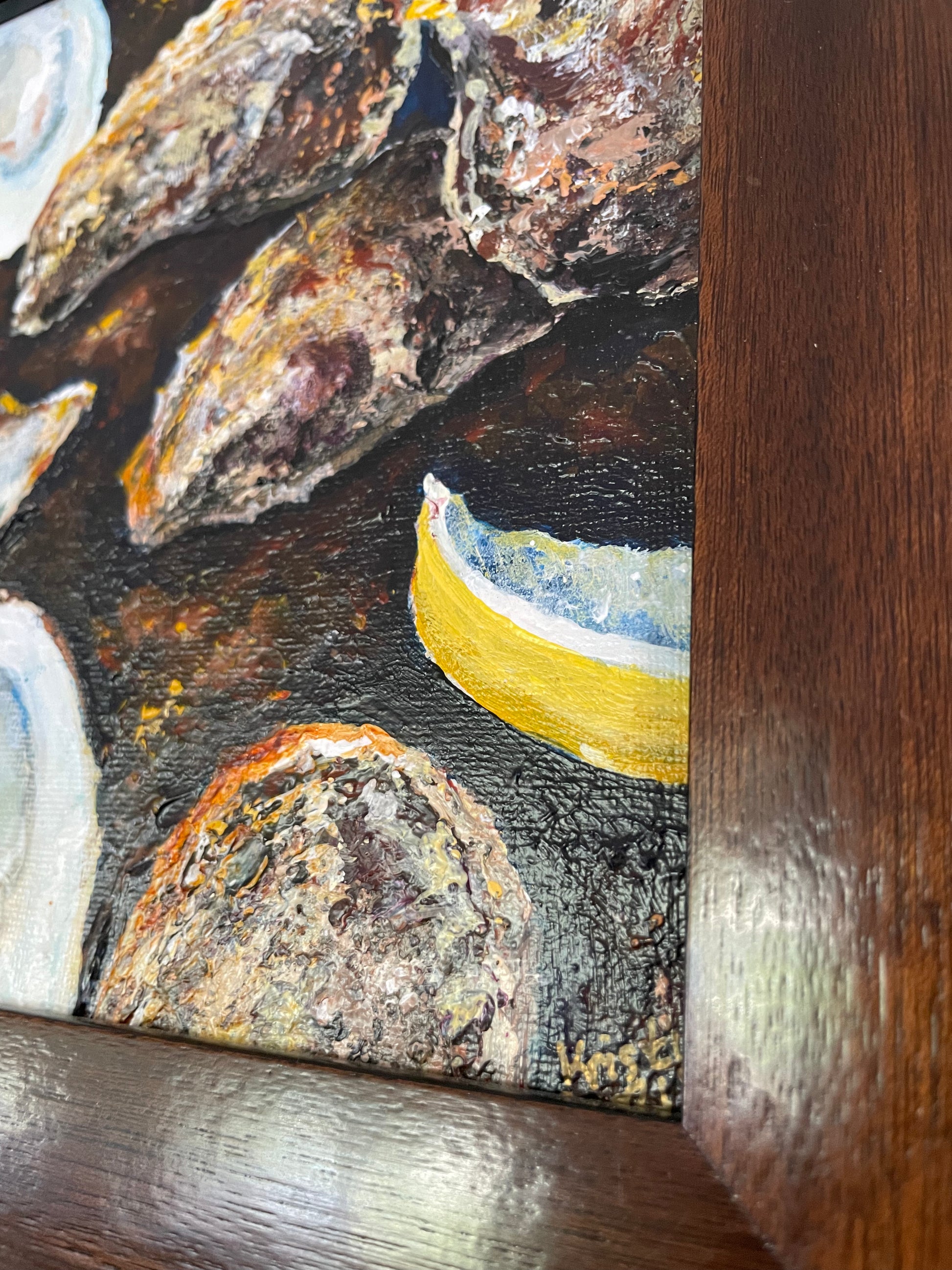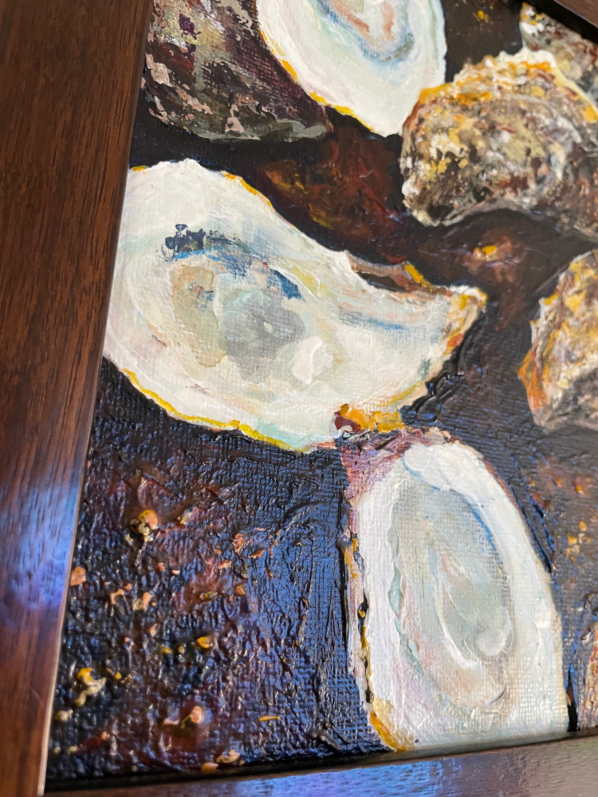 Quonnie Siren Oysters, 8x8 Acrylic Painting Framed in Dark Walnut
