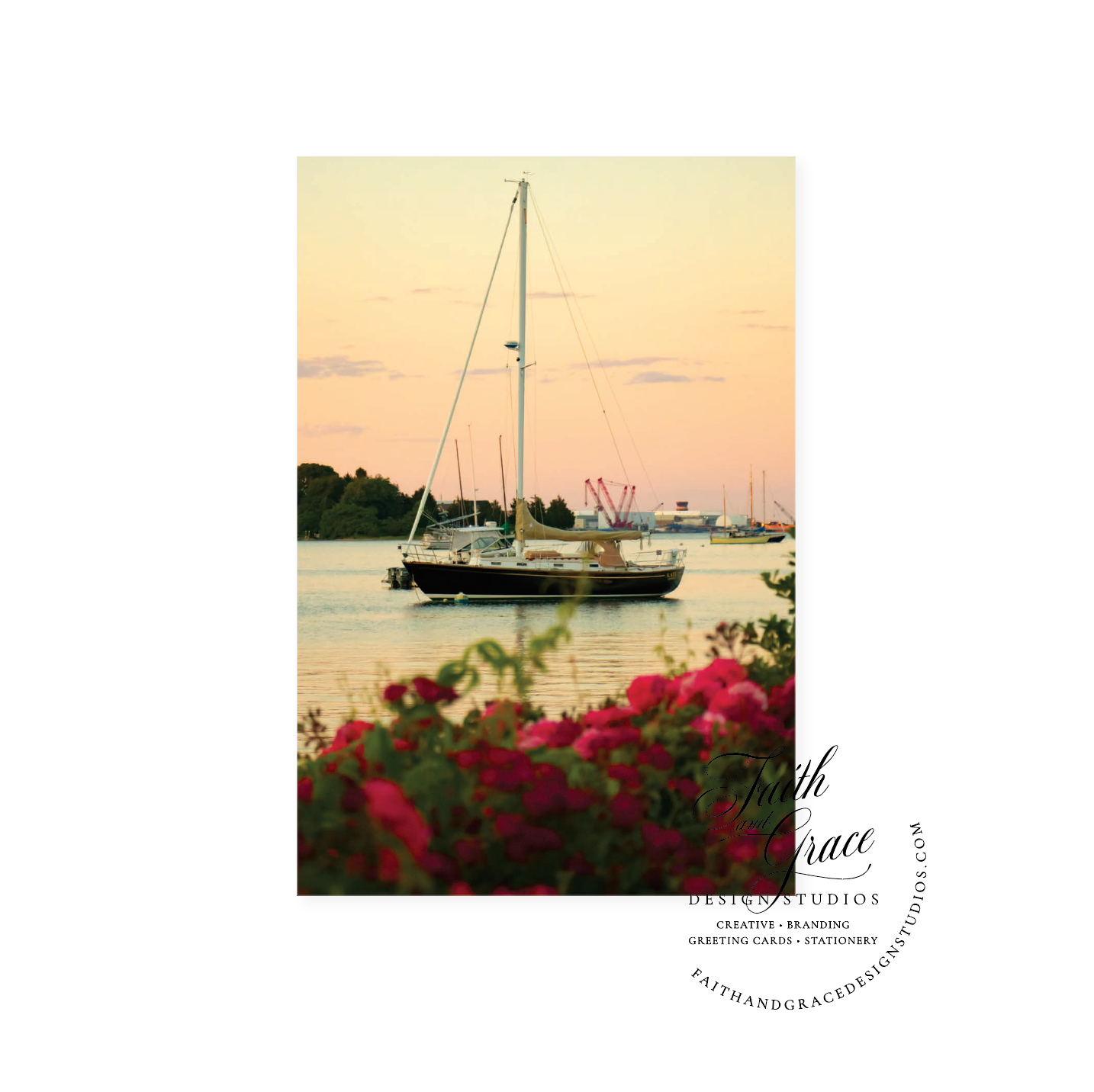 Blank notecard featuring a sailboat in the Summer at the Wharf in Wickford