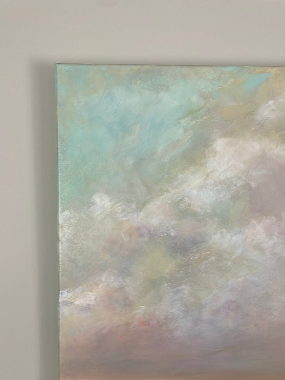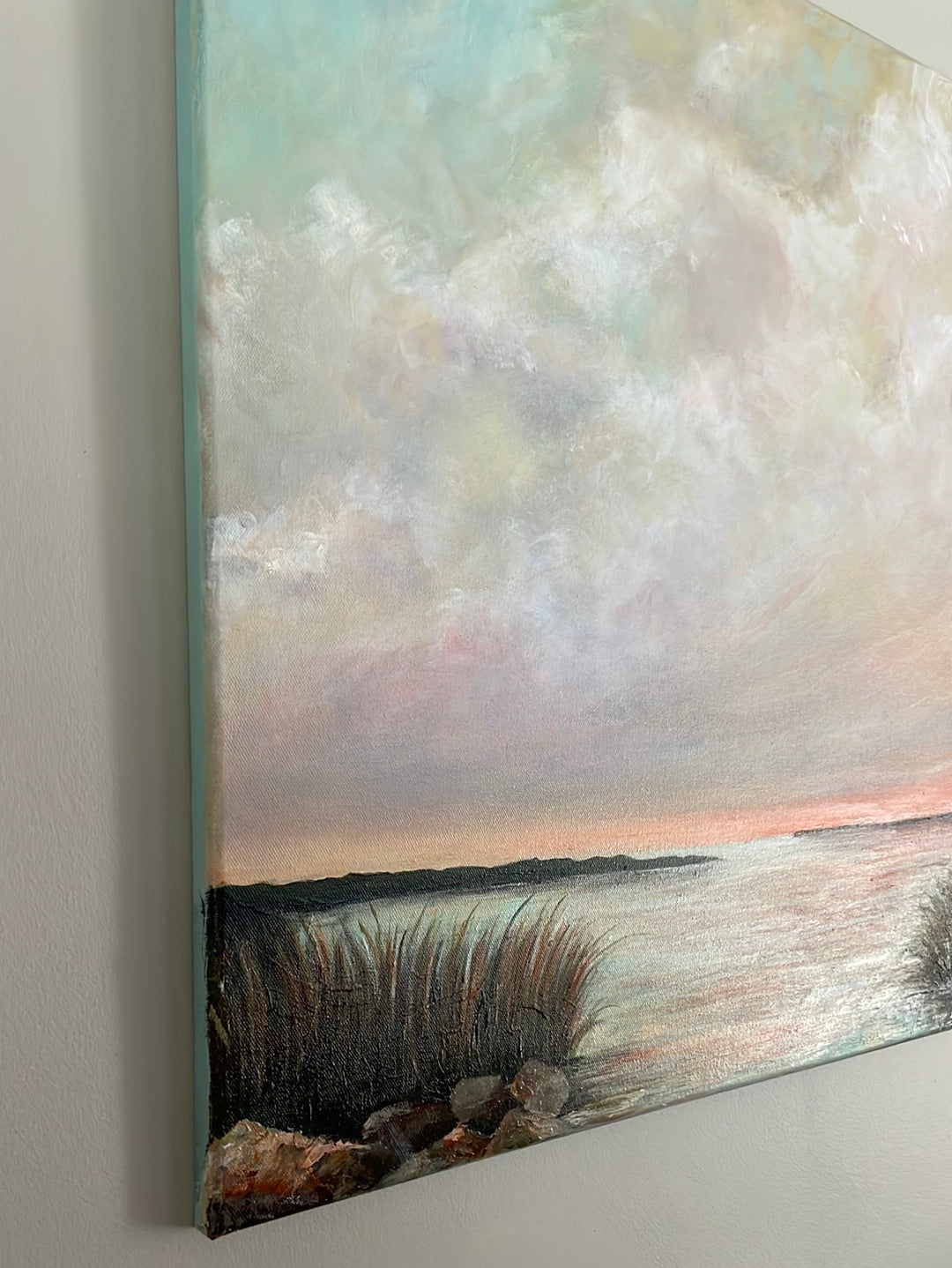 Original acrylic painting of a coastal cove reminiscent  of the coastal wetlands near Zeek's Creek in Jamestown, RI by Rhode Island artist Kristina Petrilli.